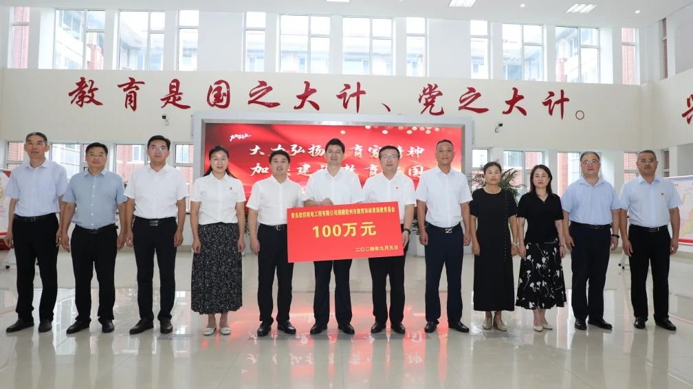 9月5日,在第 40 个教师节来临之际,青岛u体育机电工程有限公司向胶州市教育和体育局捐赠100万元,仪式在胶州市教育体育局举行。胶州市委常委、统战部部长,市政府副市长董如增出席;胶州市教育和体育局党组书记、局长、市委教育工委常务副书记尹少杰,青岛u体育机电工程有限公司总经理武守涛参加仪式并讲话。
