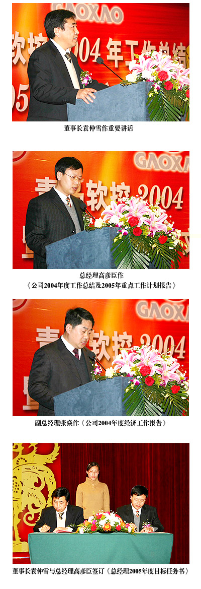 大会由副总经理王金健主持。副总经理张焱和总经理高彦臣分别作了《公司2004年度经济工作报告》、《公司2004年度工作总结及2005年工作计划报告》。会上公司各级领导分别一级对一级签订了《2005年目标计划任务书》。最后董事长袁仲雪作重要讲话。