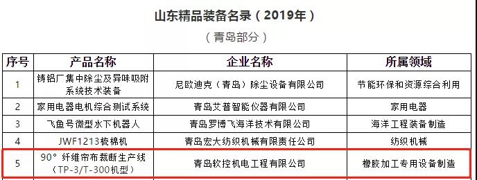 近日,山东省工业和信息化厅发布了《山东精品装备名录(2019年)》,u体育90°纤维帘布裁断生产线(TP-3/T-300机型)成功入选“山东精品装备”行列。
