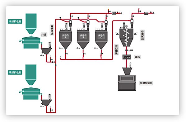 原料输送:可实现大批量、远距离、高效率输送;快速准确的取料并输送到指定位置;管道封闭输送有效避免污染。