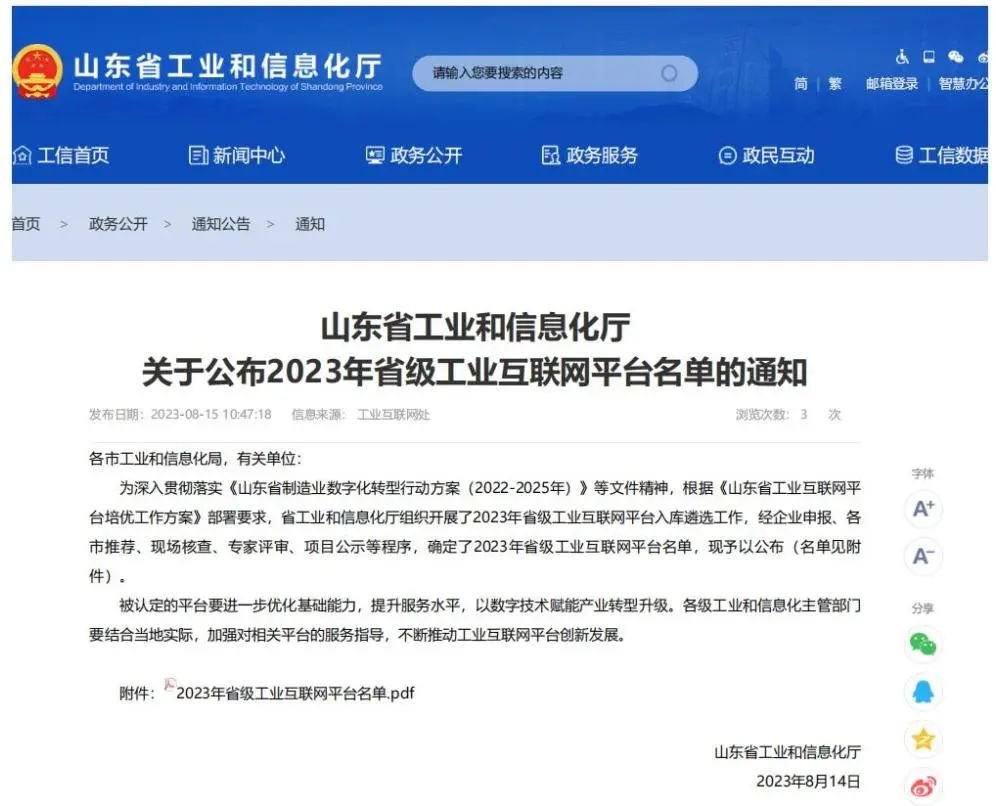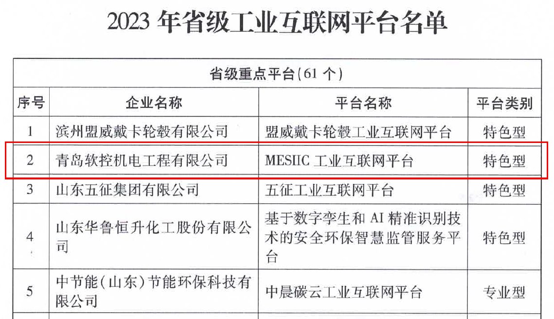 8月14日,山东省工业和信息化厅公布2023年省级工业互联网平台名单,青岛u体育机电工程有限公司的“MESIIC工业互联网平台”成功入选省级重点平台(特色型)。